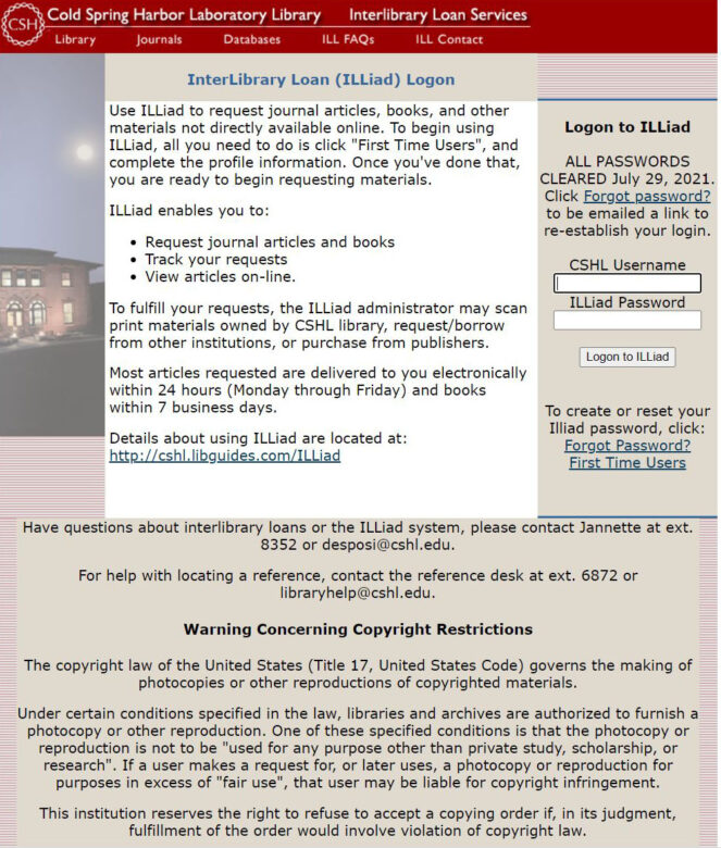 - Register for and use your ILLiad Account, a software platform that manages all requests & links you with our CSHL Library resources.