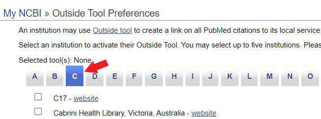 Select Outside Tool under PubMed Preferences, select “C” from the alphabetical list, and scroll down to Cold Spring Harbor Laboratory Library.