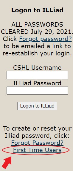Click “First Time Users” which appears on the Login to ILLiad panel on the right.