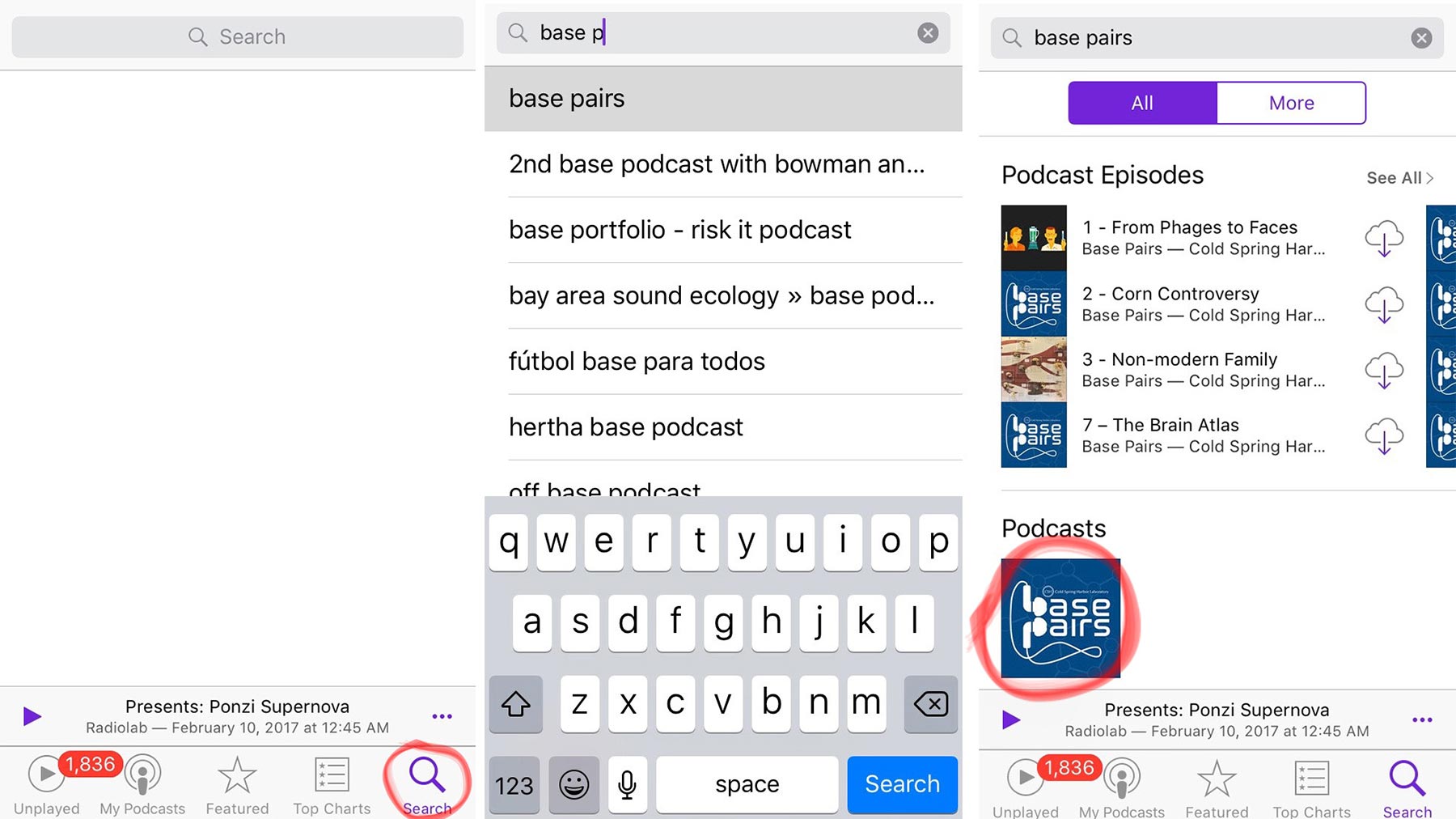 5. The newest episode of Base Pairs will now automatically appear on your device each month! You can find the Base Pairs episode you downloaded by tapping the “My Podcasts” tab at the bottom of the screen.