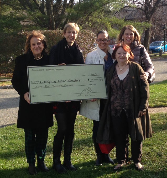 Members of the Research Committee of Manhasset Women’s Coalition Against Breast Cancer (MWCABC) presented a $65,000 check to support Dr. Camila dos Santos’ breast cancer research. Since 1999, Cold Spring Harbor Laboratory has received nearly $500,000 in funding for breast cancer research from MWCABC.